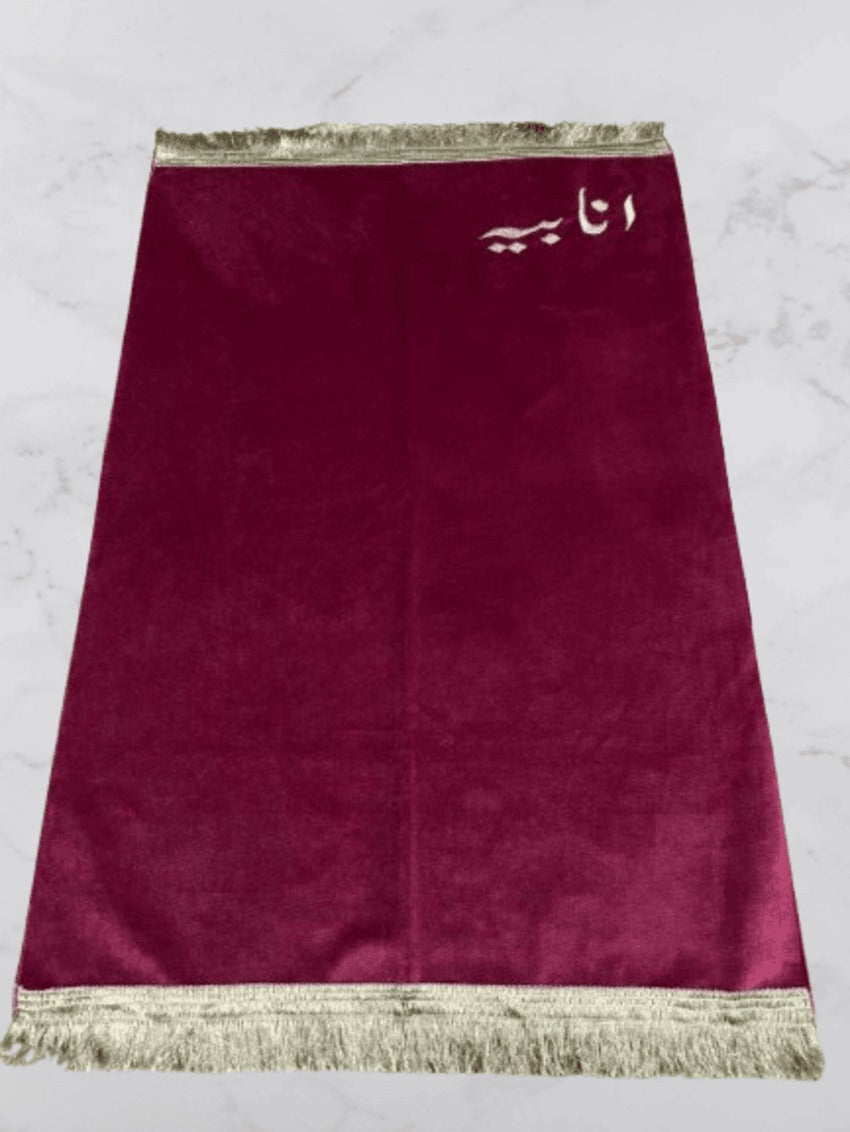 Customizable Arabic Prayer Mat and Quran, Tasbeeh – Maroon Velvet with Name Embroidery