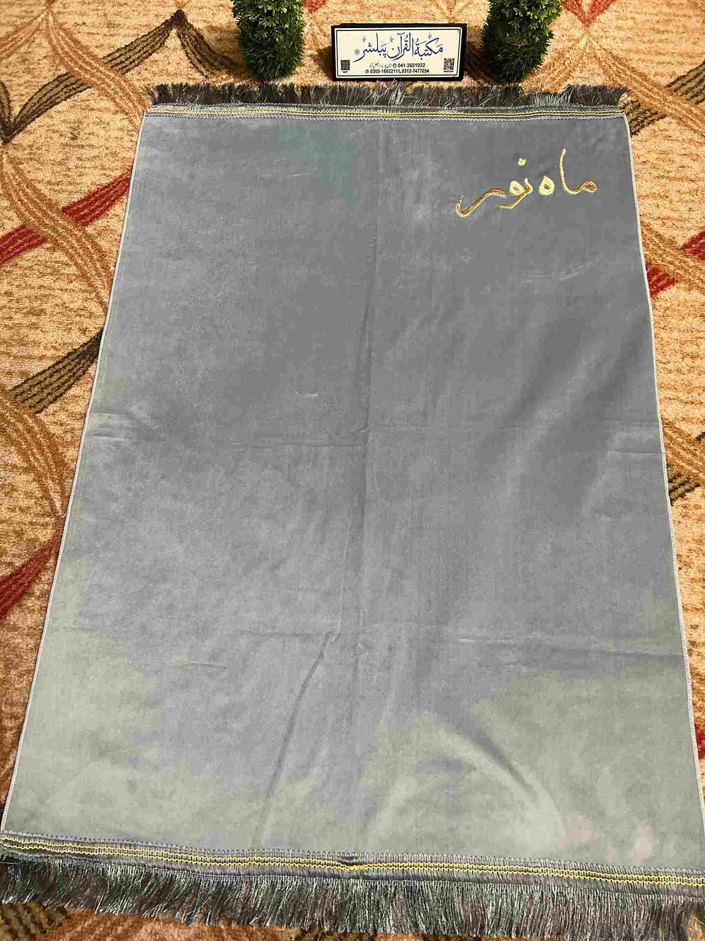 Customizable Arabic Prayer Mat Light Gray Velvet with Name Embroidery