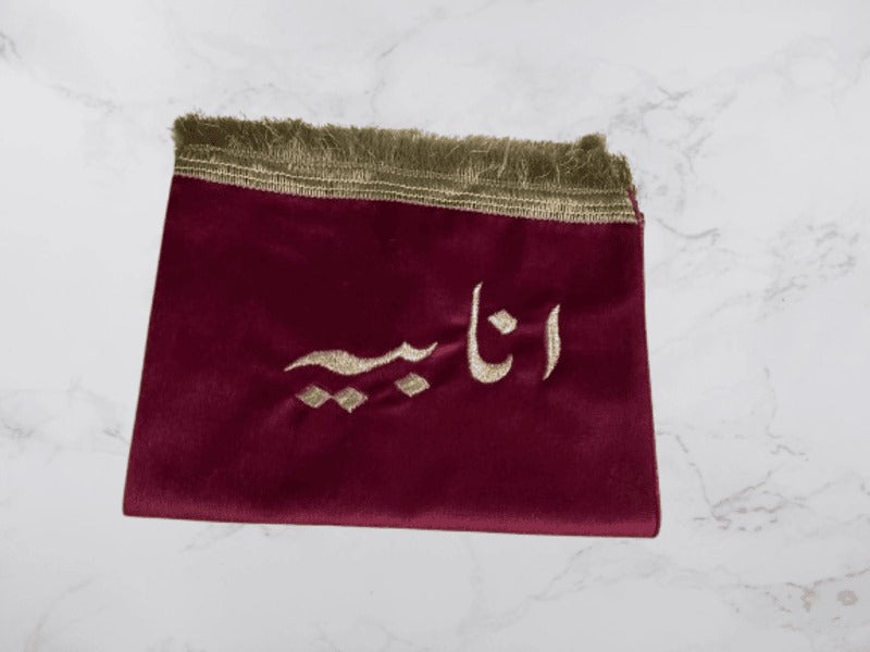 Customizable Arabic Prayer Mat Maroon Velvet with Name Embroidery