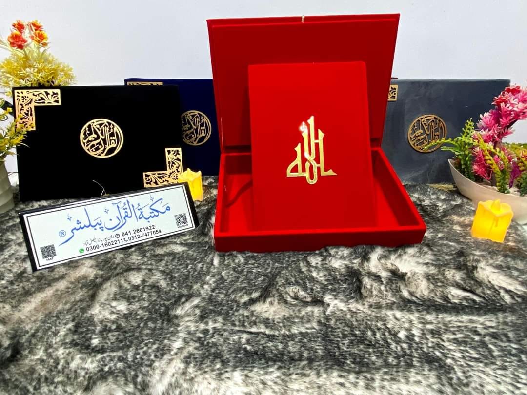 "مکتبۃ القران پبلشر" کی جانب سے ایک بہترین اور دل کش پروڈکٹ پیش کر رہے ہیں ویلویٹ فینسی برائڈل قرآن سیٹ اس کے ساتھ ایک ویلویٹ وڈ خاص باکس ،قرآن پاک ویلویٹ جلد کے ساتھ☑️ بھی فراہم کیا جا رہا ہے