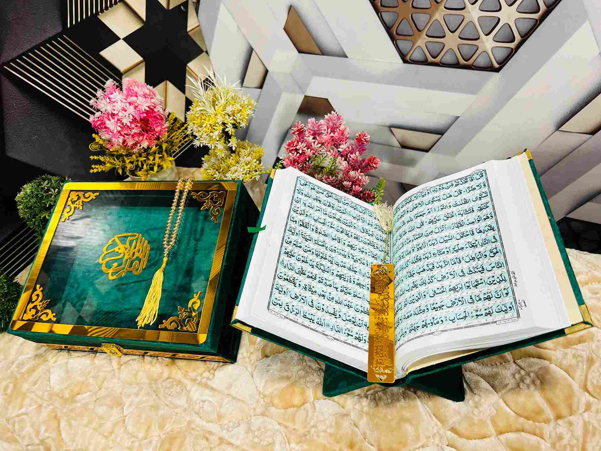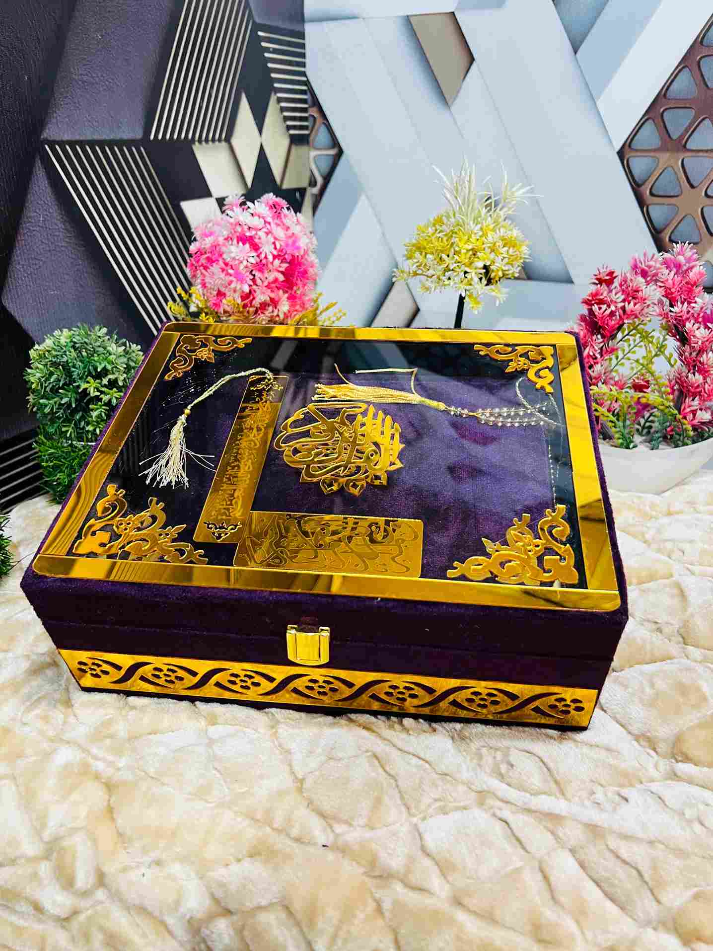 Open display box showing Quran with Translation, Rahal, Tasbeeh, bookmark, and Attar