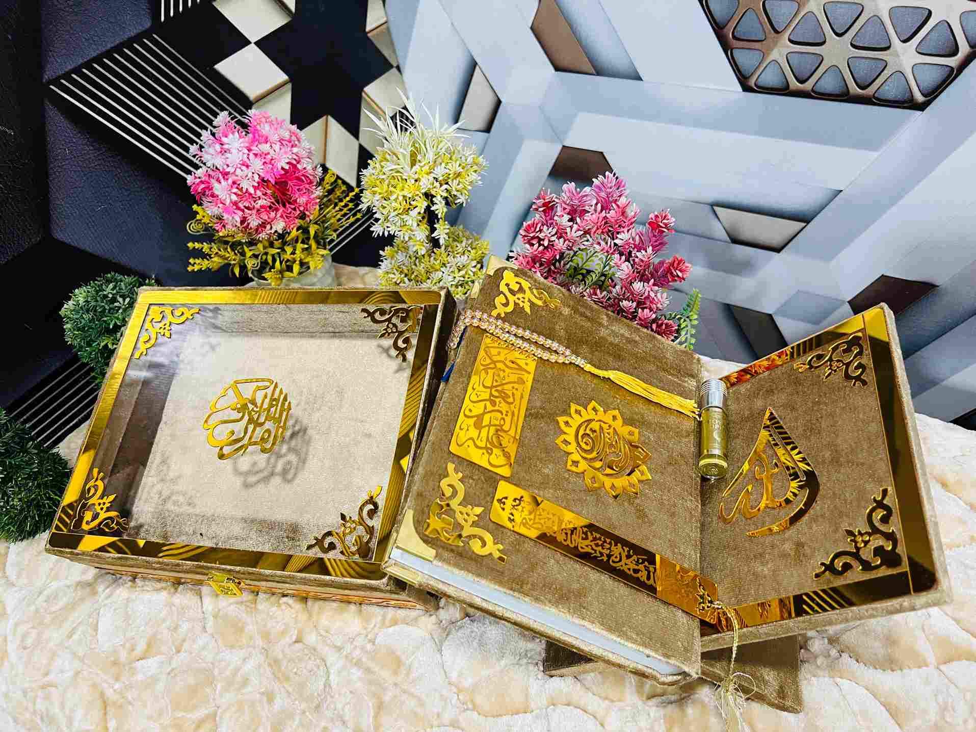 Golden beads Tasbeeh and fragrant Attar included with the Quran set