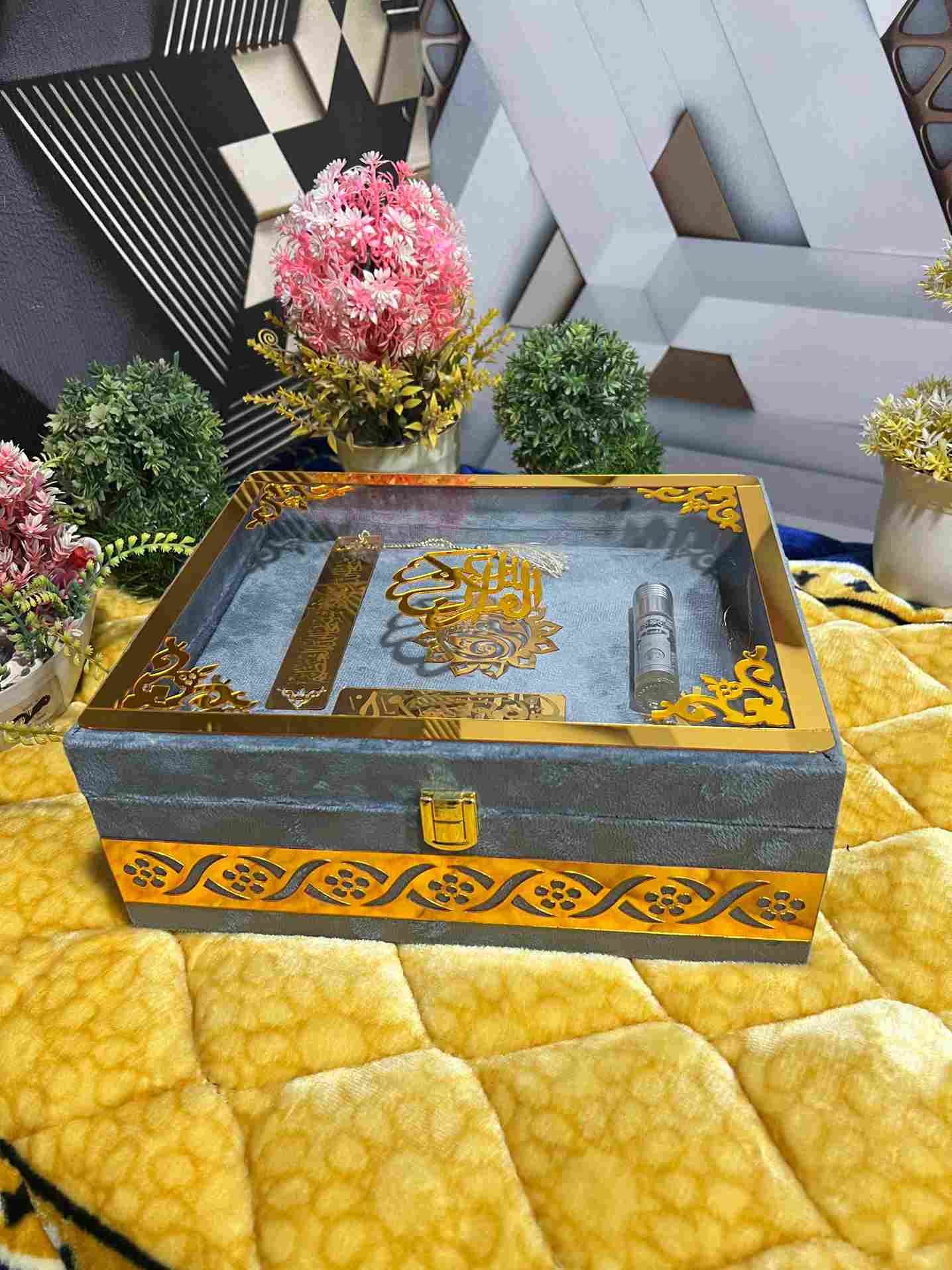 Open display box showing Quran with Translation, Rahal, Tasbeeh, bookmark, and Attar