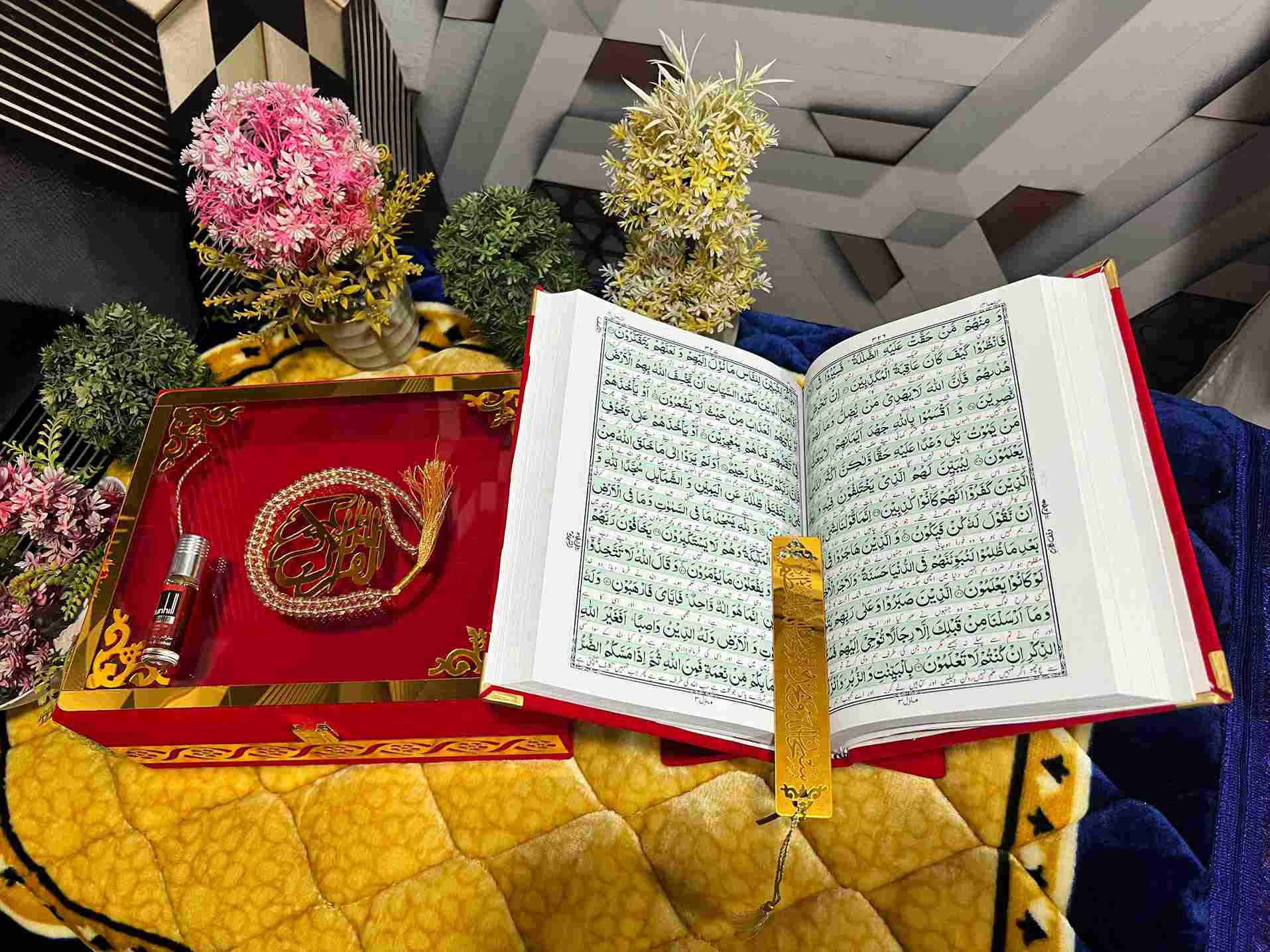 Open display box showing Quran with Translation, Rahal, Tasbeeh, bookmark, and Attar