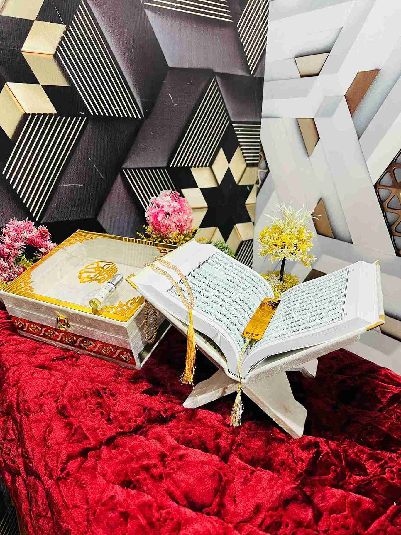 Open display box showing Quran with Translation, Rahal, Tasbeeh, bookmark, and Attar