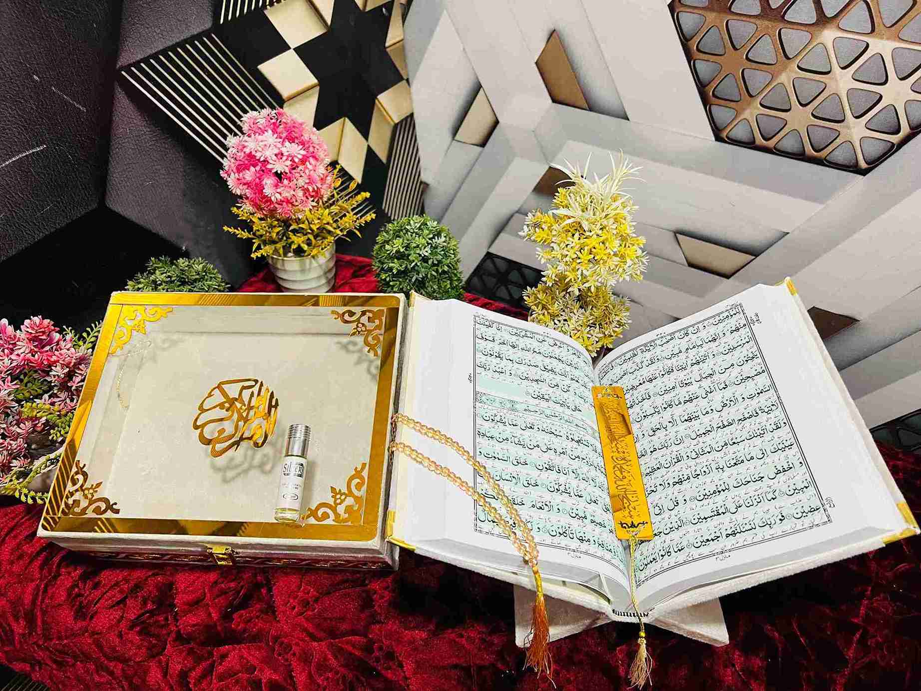 Golden beads Tasbeeh and fragrant Attar included with the Quran set