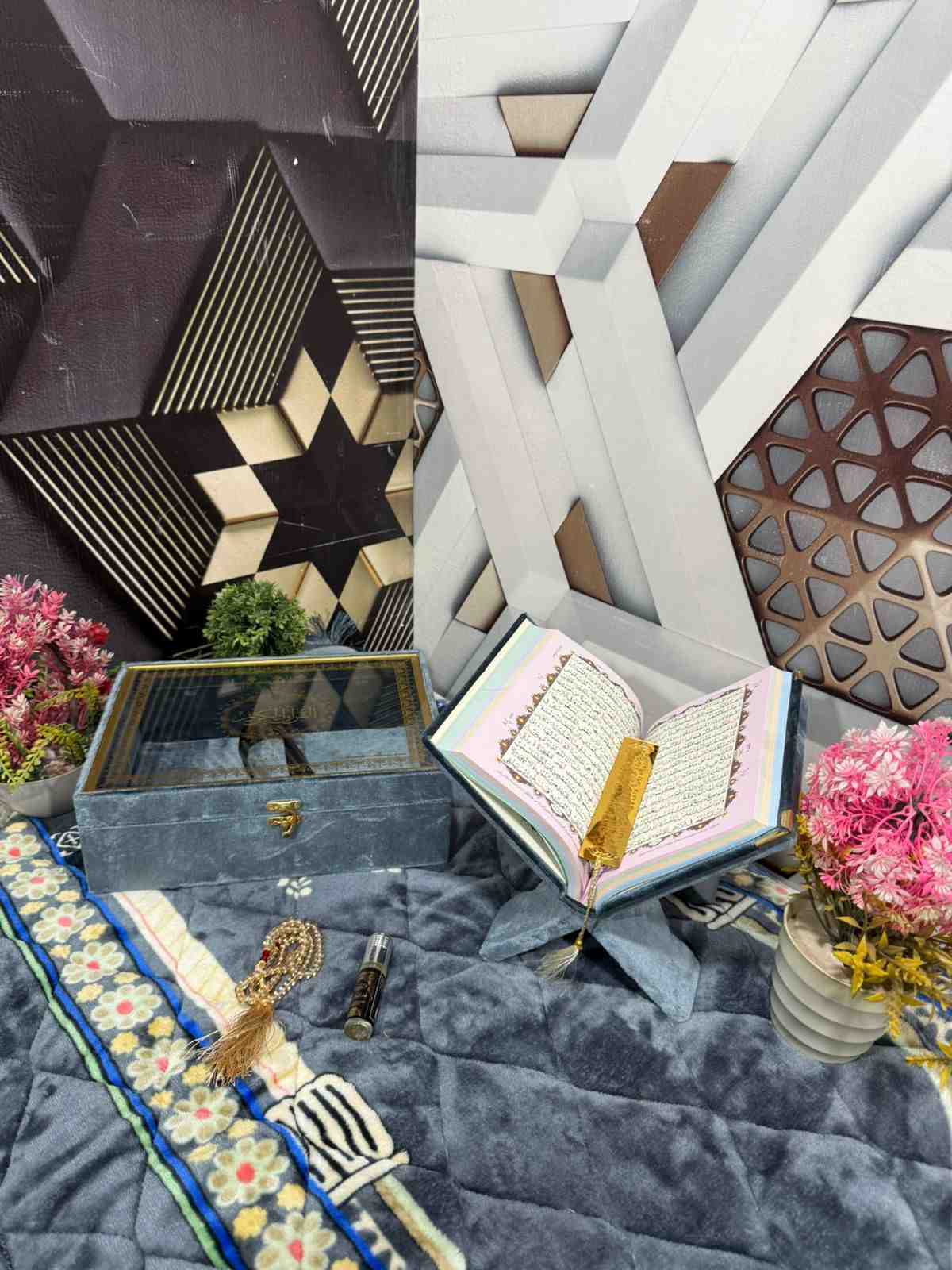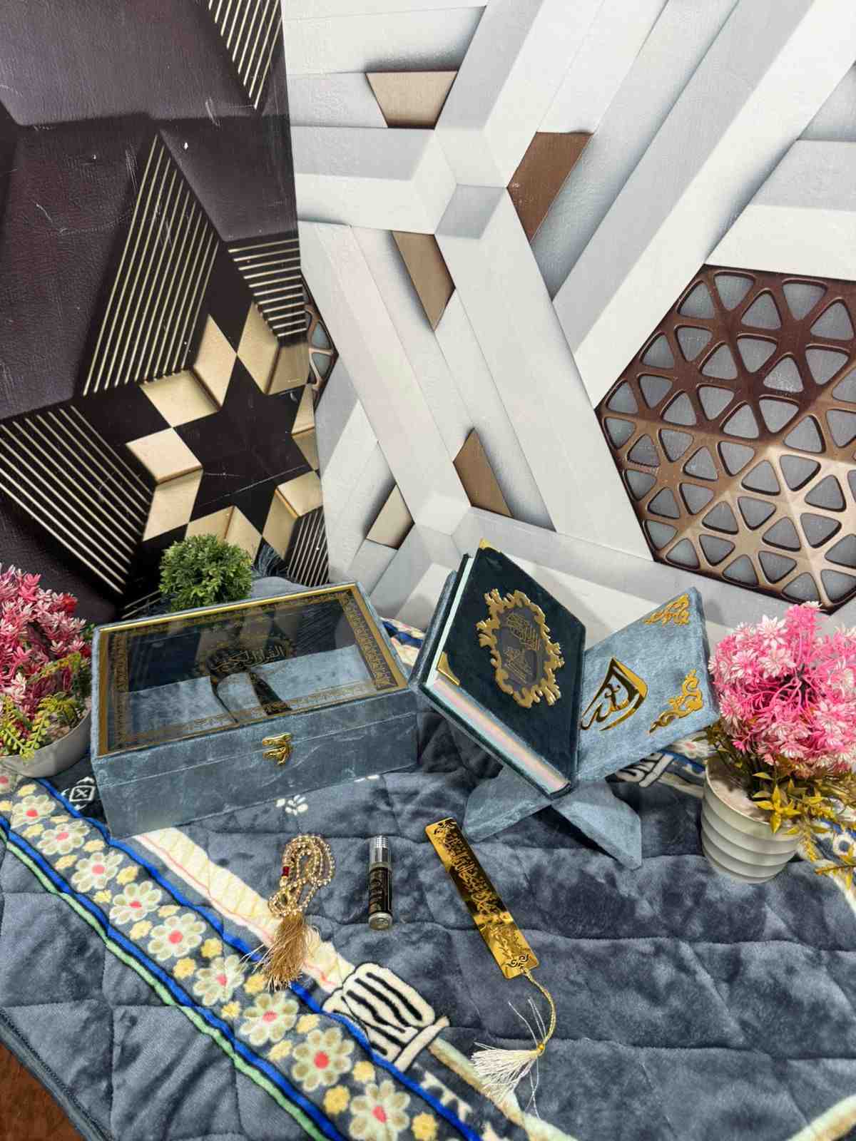 Premium Bridal Quran Gift Set Gray Color Transparent Set, Velvet Holly Quran, Book Mark, Velvet Box, Velvet Rahal, Ittar, Tasbeeh