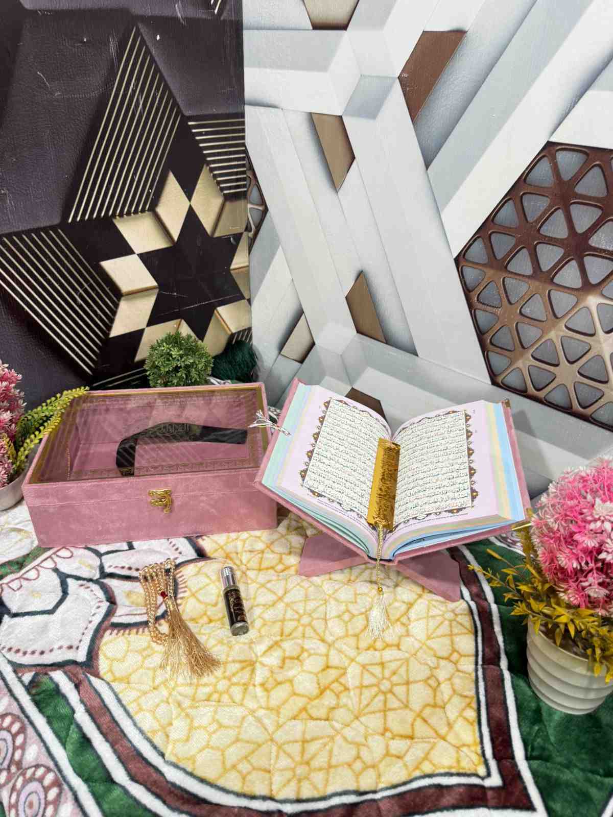 Premium Bridal Quran Gift Set Pink Color Transparent Set, Velvet Holly Quran, Book Mark, Velvet Box, Velvet Rahal, Ittar, Tasbeeh